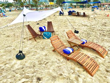 Set-Up for 4 includes: 2 Chaise Lounges, 2 Melino Chairs, Canopy, Table, Cooler Bag w/Ice, 4 Towels, and Beach Blanket.